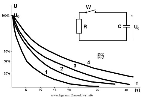 . W chwili t = 0 zamknięto wyłącznik W. Napięcie na kondensatorze C zaczęło się zmieniać zgodnie z krzywą oznaczoną cyfrą