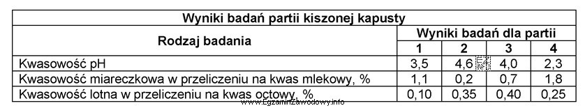 Korzystając z informacji zamieszczonych w tabeli, określ w której partii kiszonej kapusty najintensywniej zachodziła niepożądana fermentacja octowa?