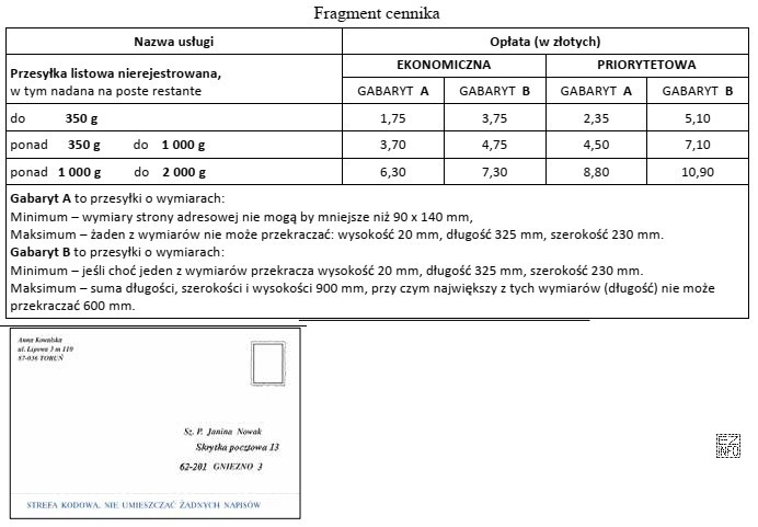 Ile zapłaci klient za wysłanie przedstawionego listu o wadze 49 g, gabaryt A.