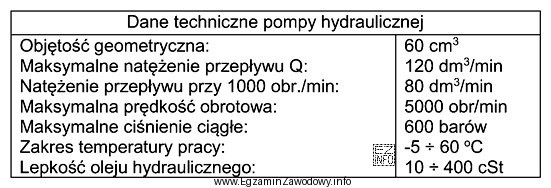 Maksymalne natężenie przepływu dla pompy hydraulicznej, której dane katalogowe zamieszczono w ramce, wynosi