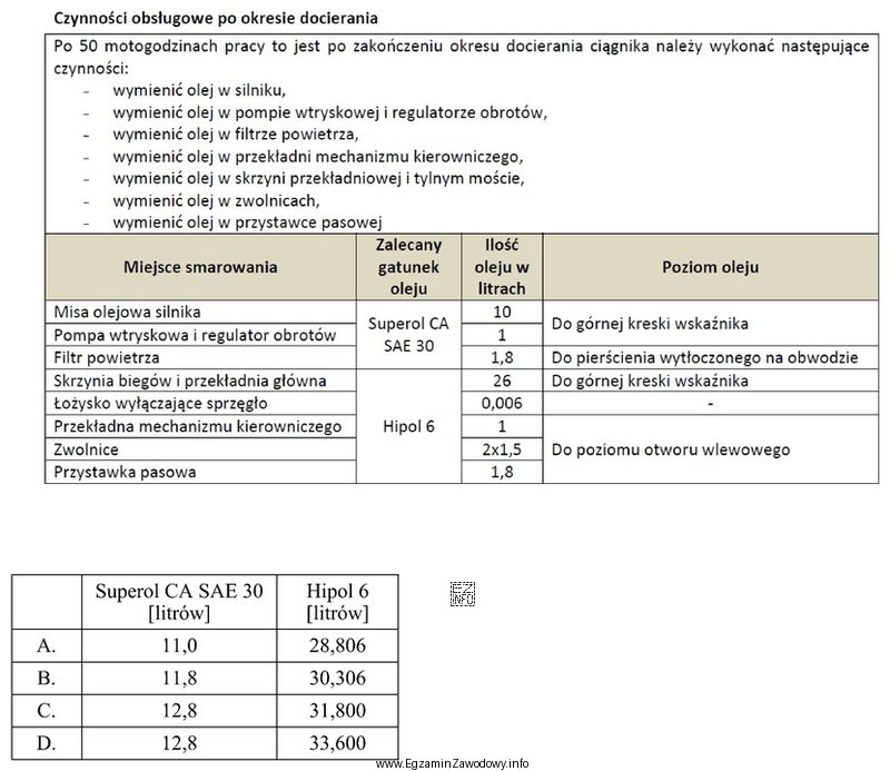 Na podstawie zamieszczonego fragmentu instrukcji obsługi ciągnika określ, jakie ilości olejów należy zakupić w celu wykonania przeglądu po okresie docierania?