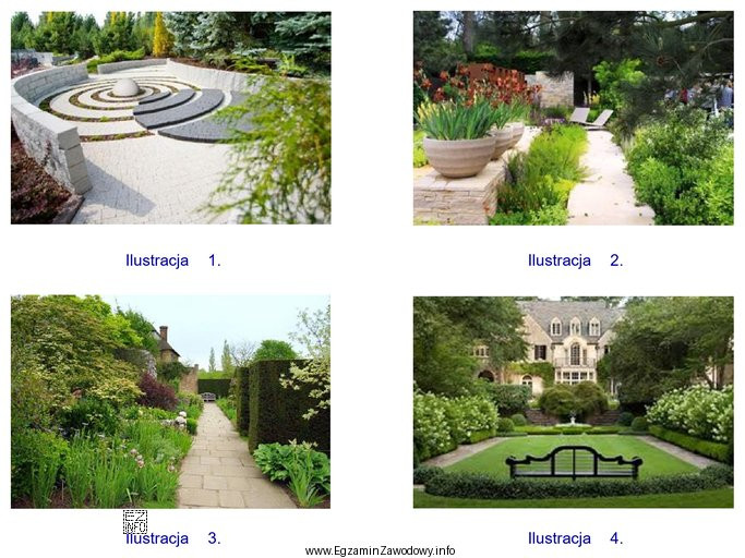 Na której ilustracji przedstawiono widok fragmentu ogrodu o symetrycznym układzie kompozycji?