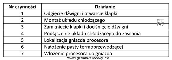 Wskaż poprawną kolejność czynności prowadzących do zamontowania procesora w gnieździe LGA na nowej płycie głównej, odłączonej od źródła zasilania.