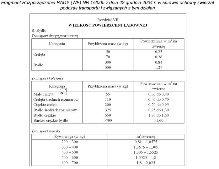 Na podstawie fragmentu rozporządzenia określ minimalną powierzchnię środka transportu morskiego, potrzebną do przewozu 22 sztuk zwierząt, jeśli masa pojedynczego zwierzęcia jest nie mniejsza niż 300 kg i nie większa niż 310 kg?