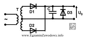 Aby wyeliminować nadmierny wzrost amplitudy tętnień na wyjściu prostownika, w układzie zasilania zamieszczonego na rysunku, należy w pierwszej kolejności wymienić