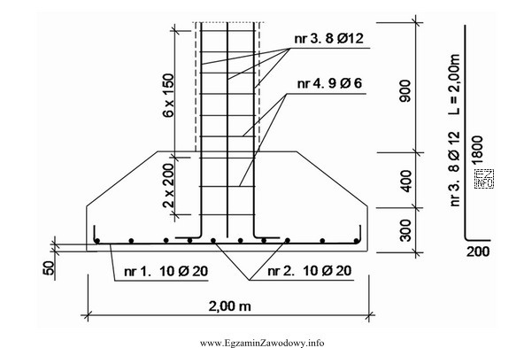 Z przedstawionego rysunku przekroju stopy słupa żelbetowego wynika, że zbrojenie pionowe łączące stopę ze słupem należy wykonać z