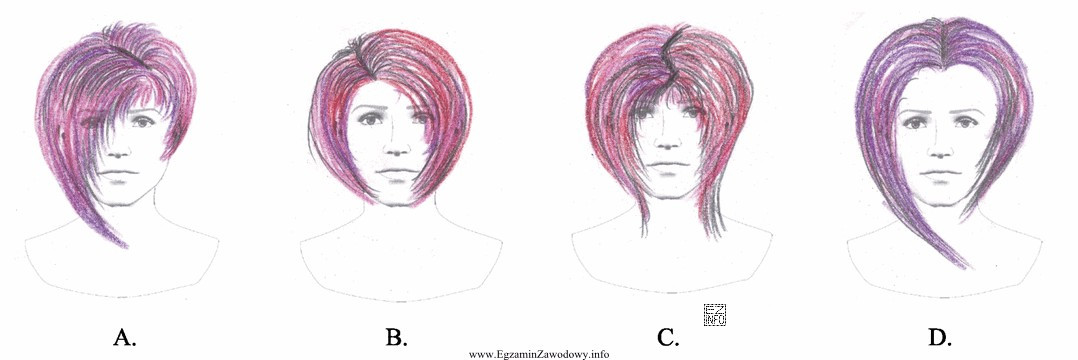 Wskaż rysunek fryzury z zaprojektowanym symetrycznym przedziałkiem.