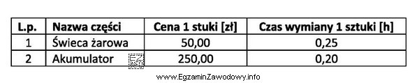 Jaki będzie całkowity koszt naprawy ciągnika rolniczego z czterocylindrowym silnikiem, polegającej na wymianie świec żarowych i akumulatora przez zakład, w którym koszt jednej roboczogodziny wynosi 100 zł brutto?